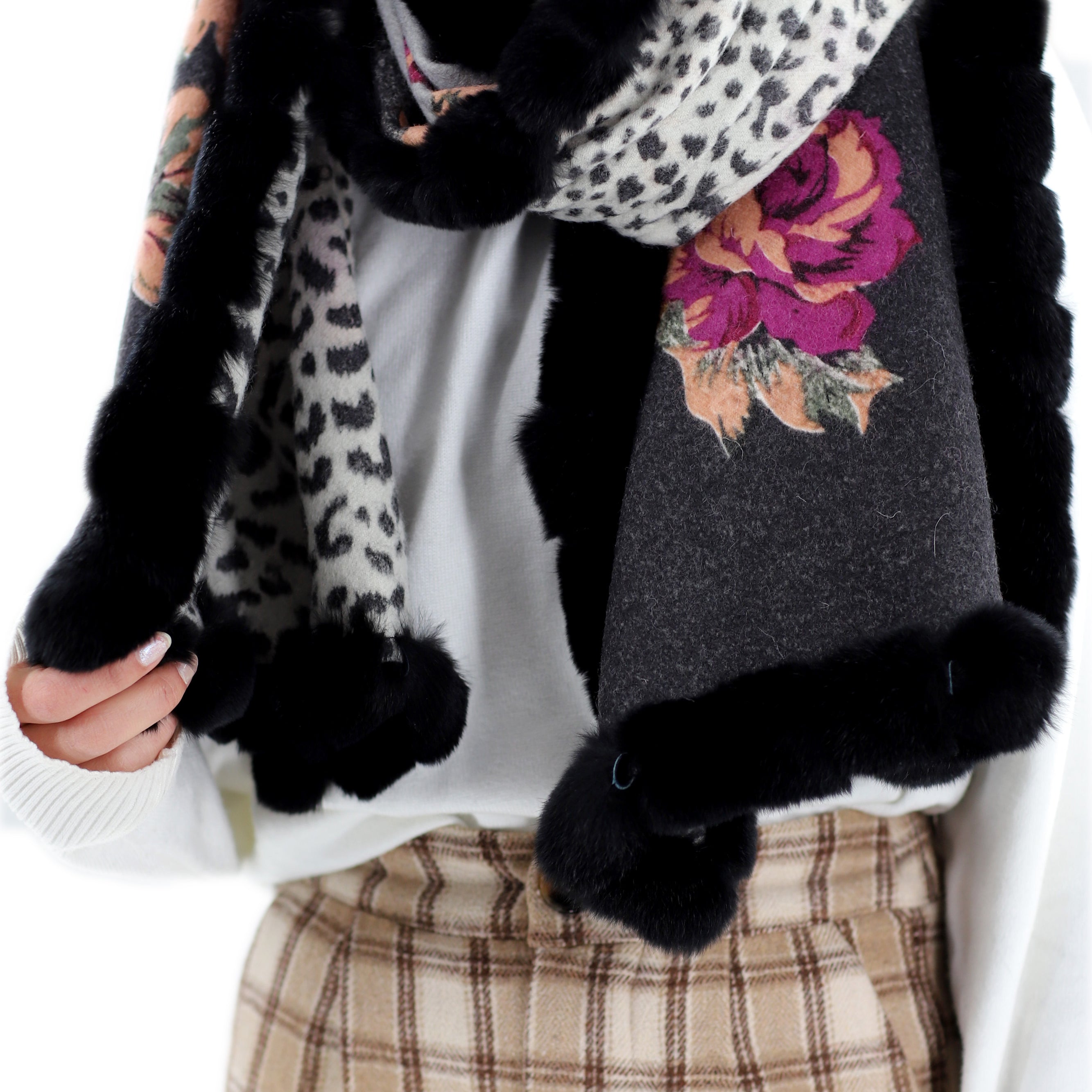 - Floral Reversible Animal Print Wrap with Genuine Real Rex Rabbit Fur Trim