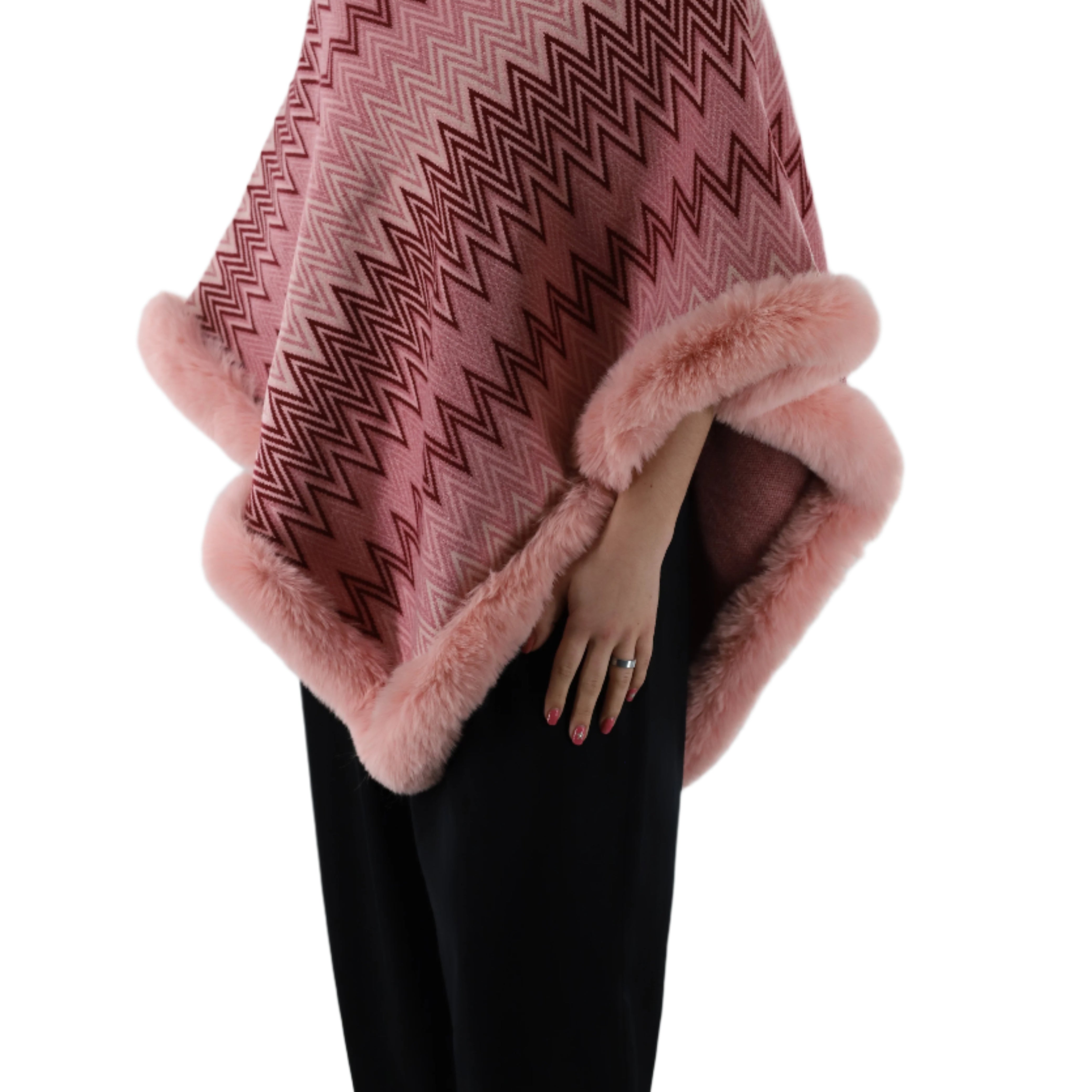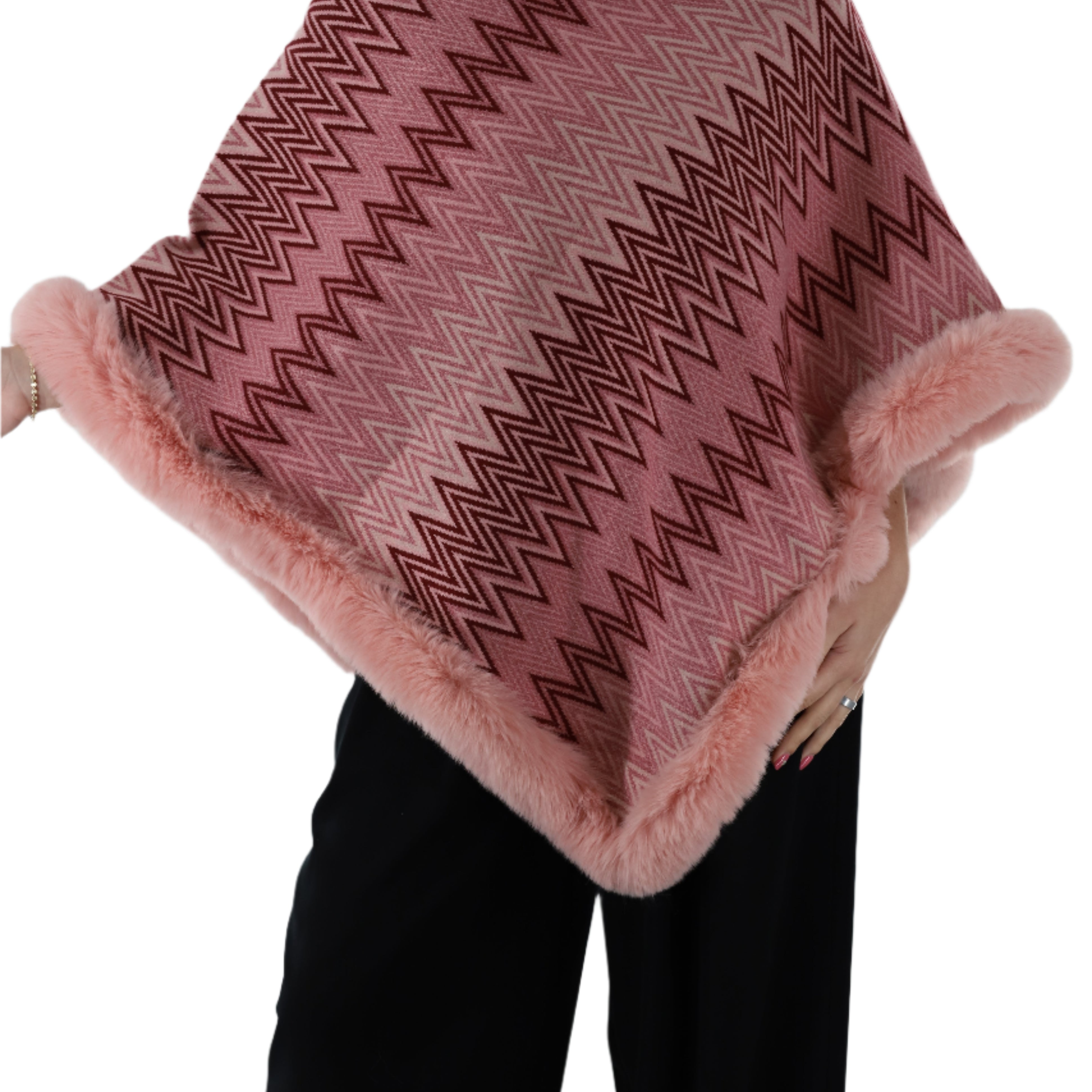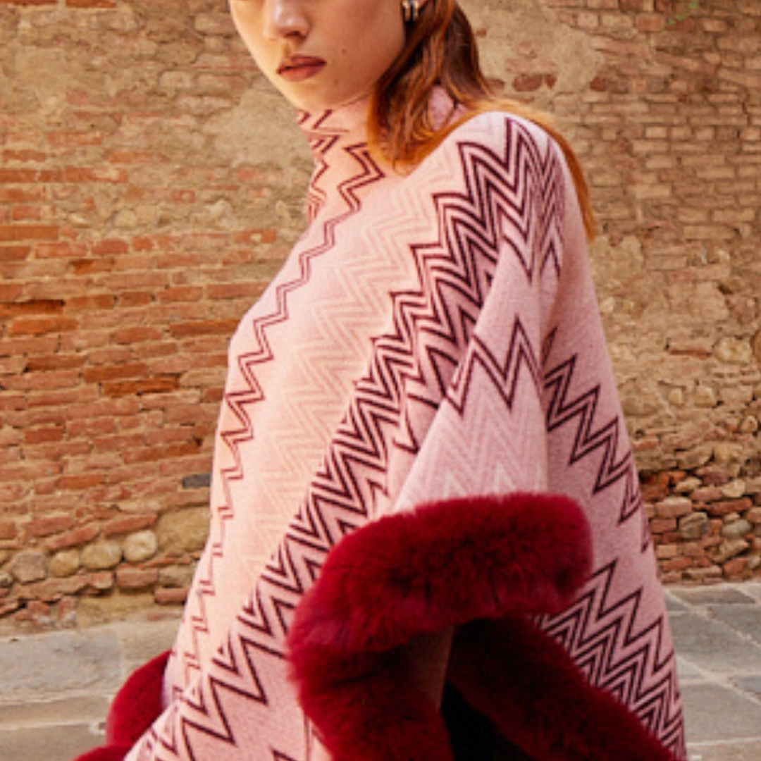 Zig zag print poncho with faux fur trim