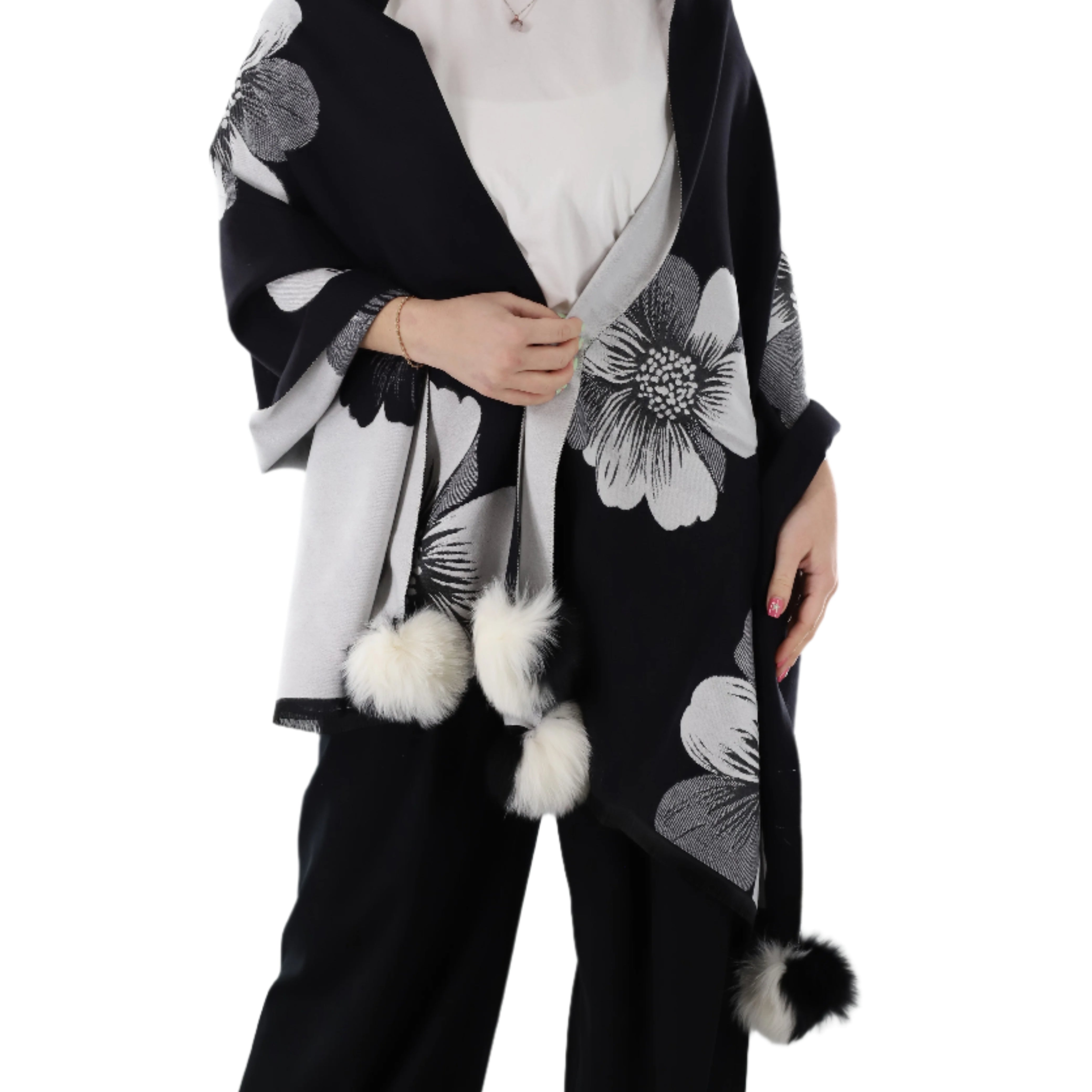 La Fiorentina | Floral Print Wrap with Fox Poms | Black/White