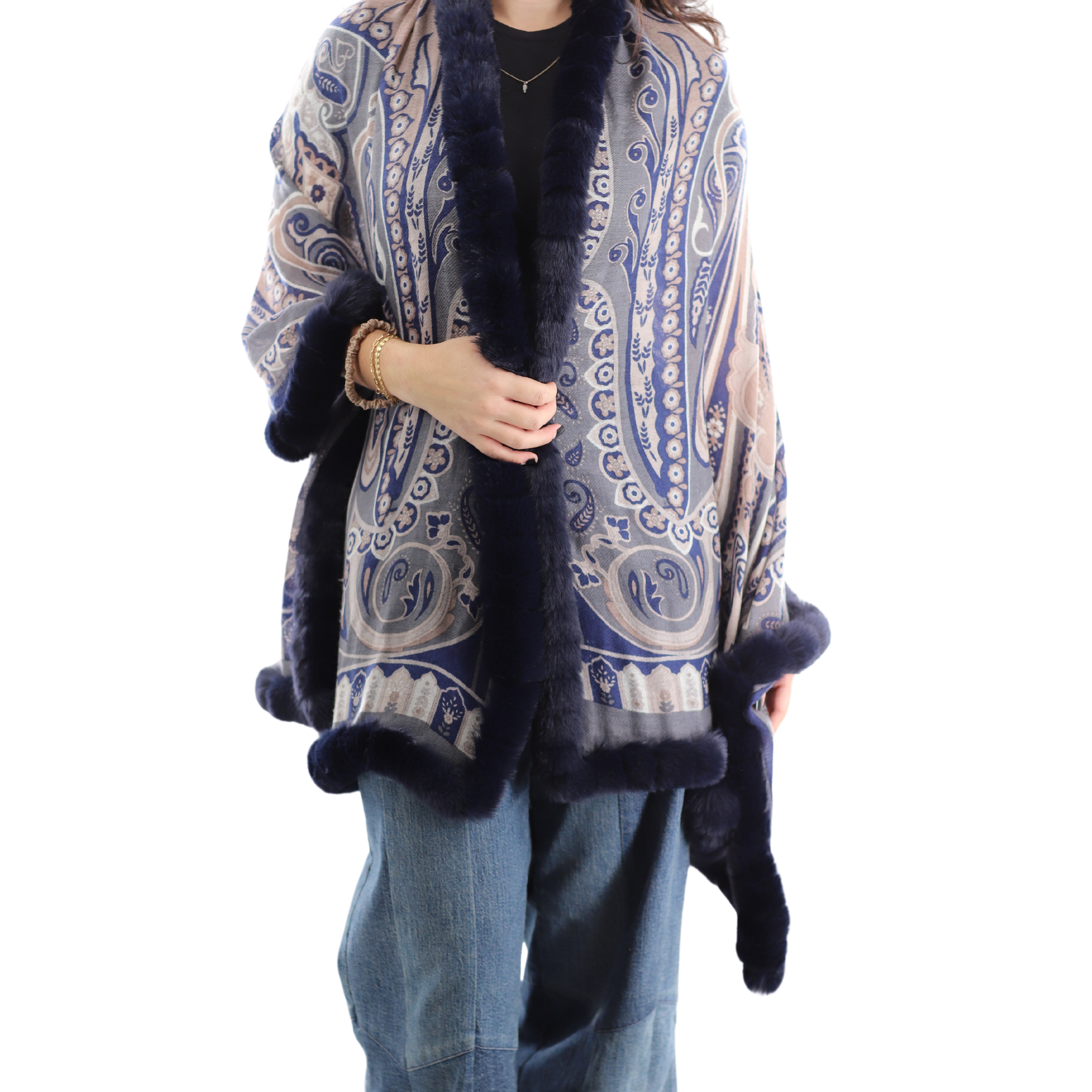 Paisley Print Wrap with faux fur trim - NAVY