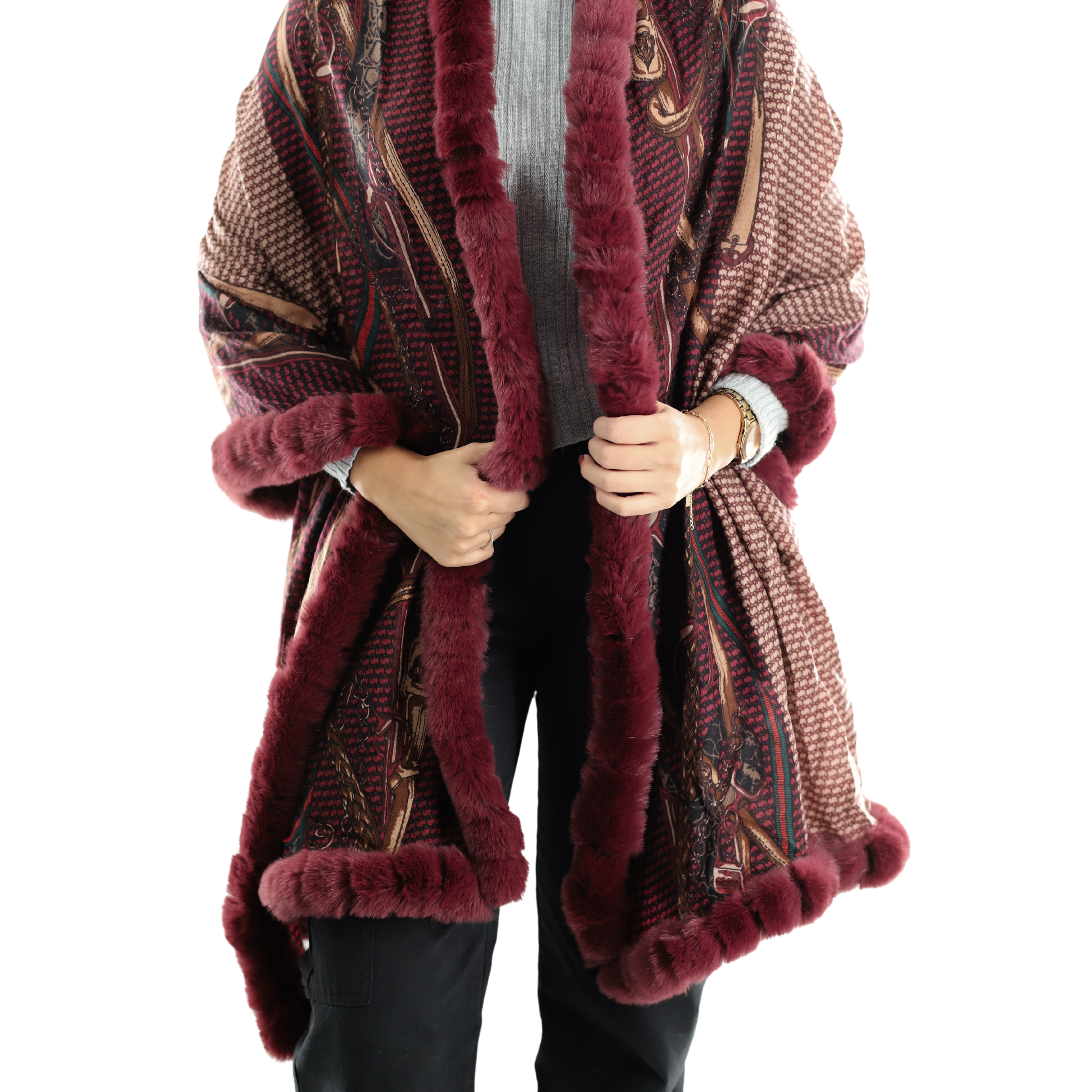 CHAIN PRINT WRAP WITH FAUX FUR TRIM