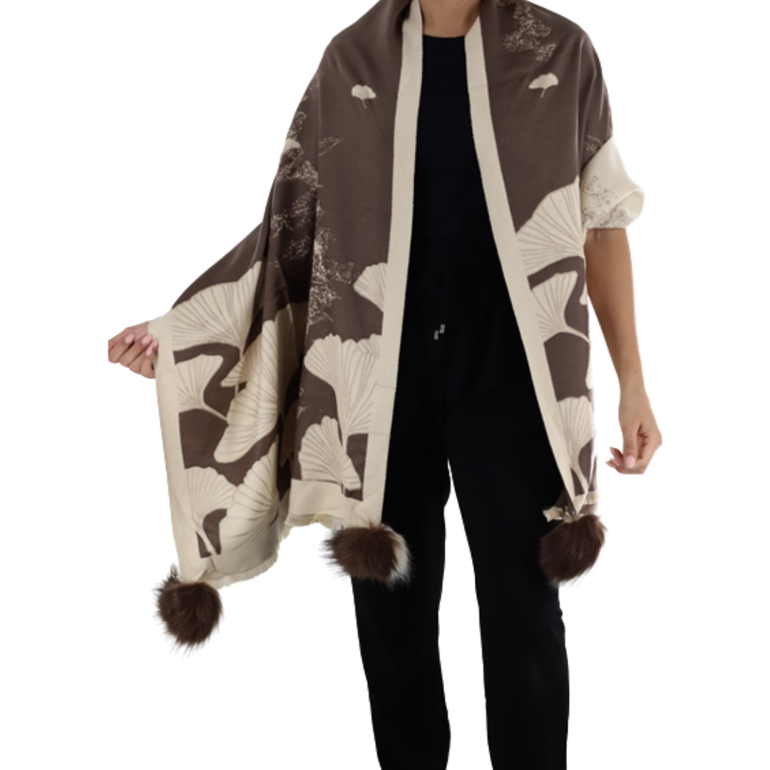 Shell Print Wrap With Faux Pom-Poms