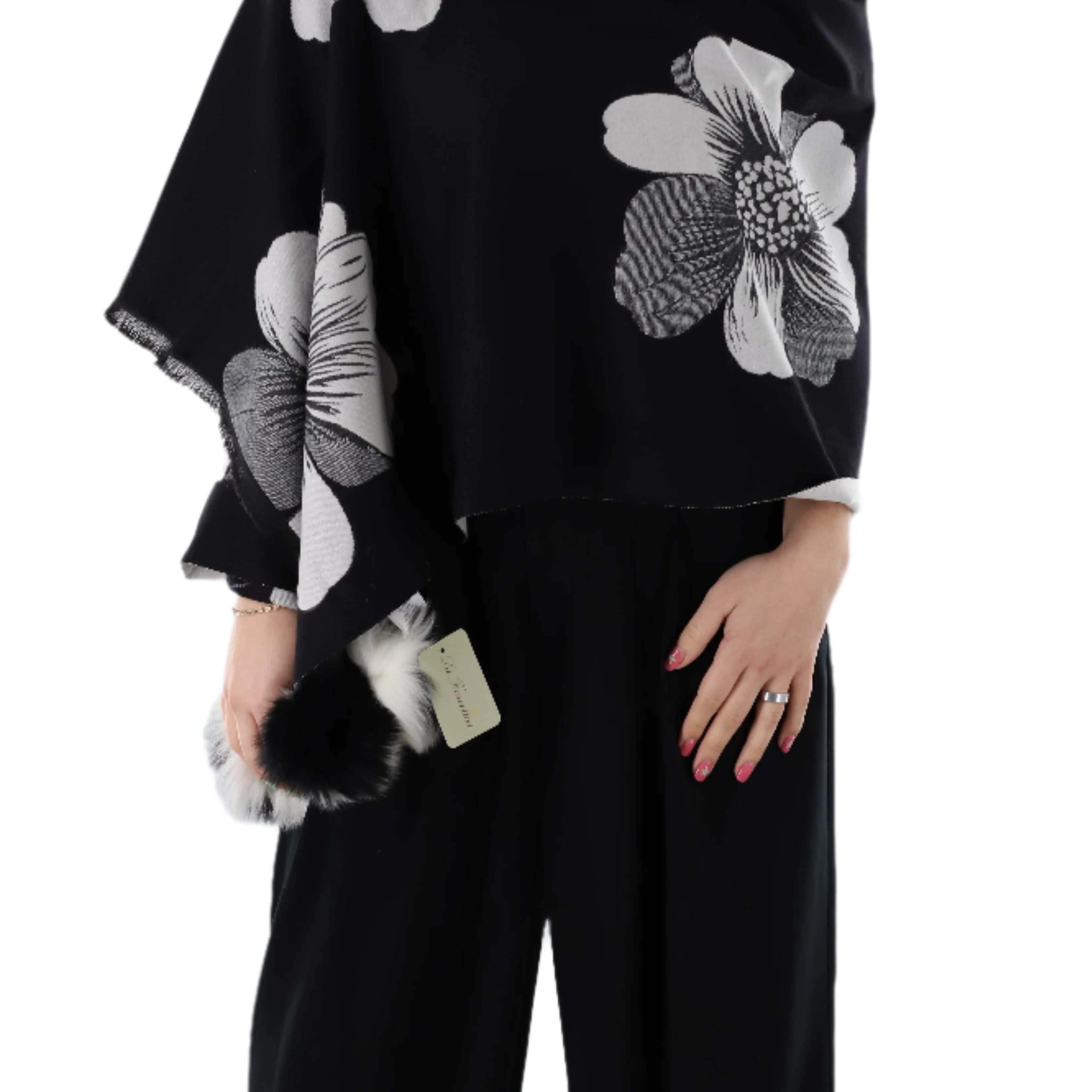 Our elegant wrap will take you from day to night in effortless style. Expertly crafted with a luxe floral print, it is finished off with two beautiful fox poms, evoking an exquisite classic look. With a standout black and white contrast, this wrap is sure to inspire admiration.