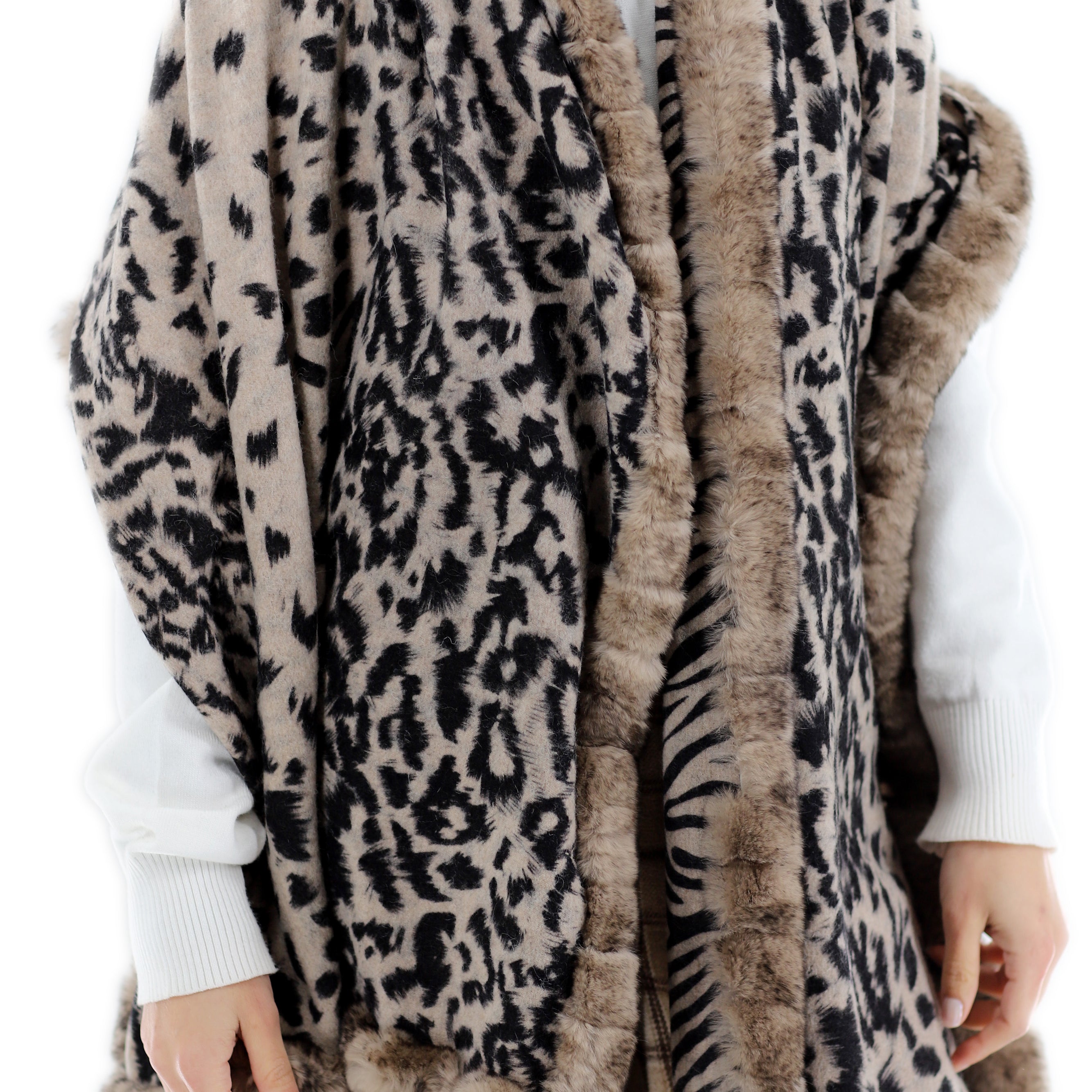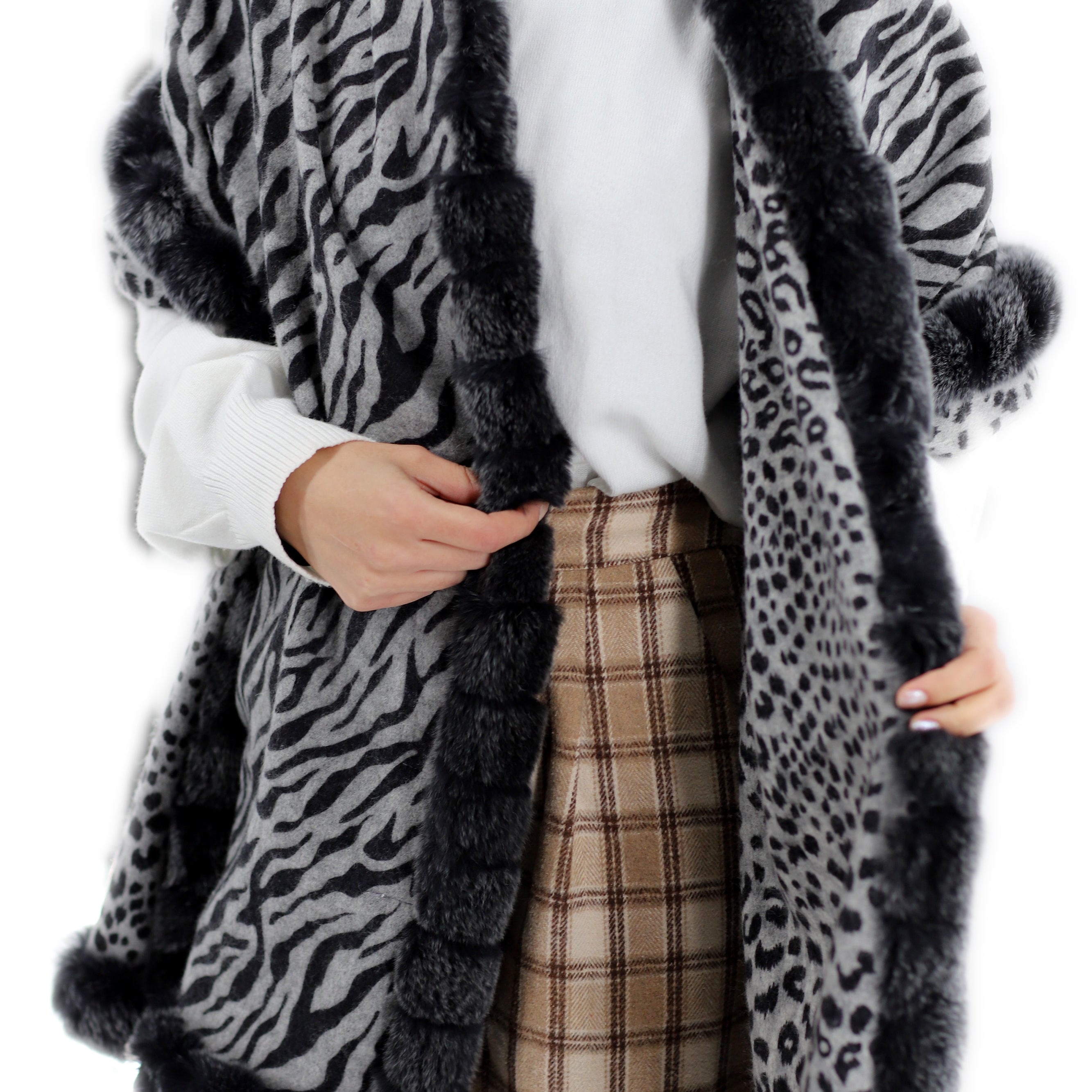 Reversible Grey Leopard Print Wrap with Genuine Rex Rabbit Fur Trim - Grey Leopard