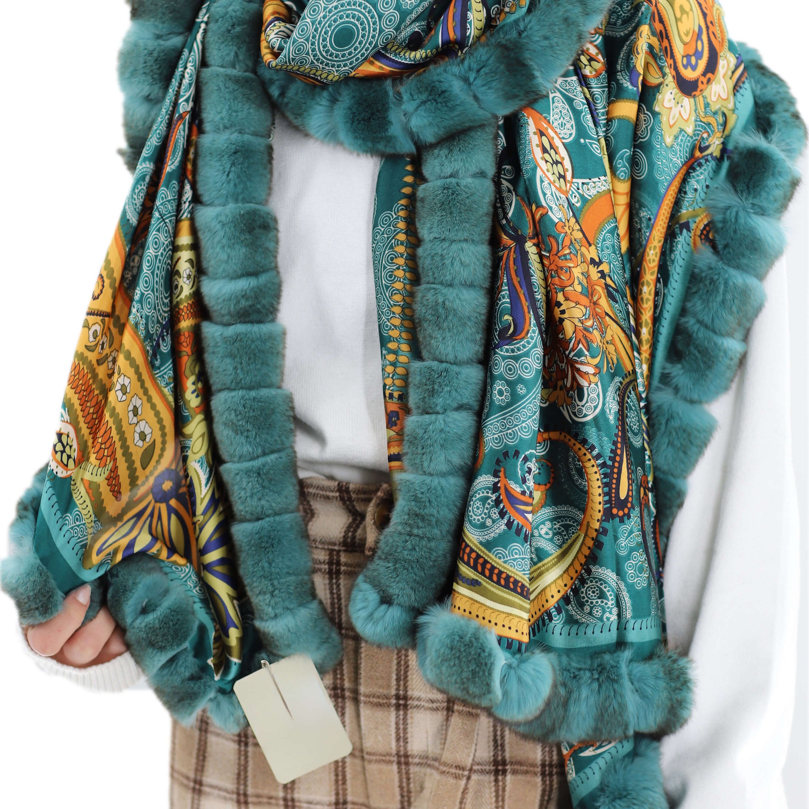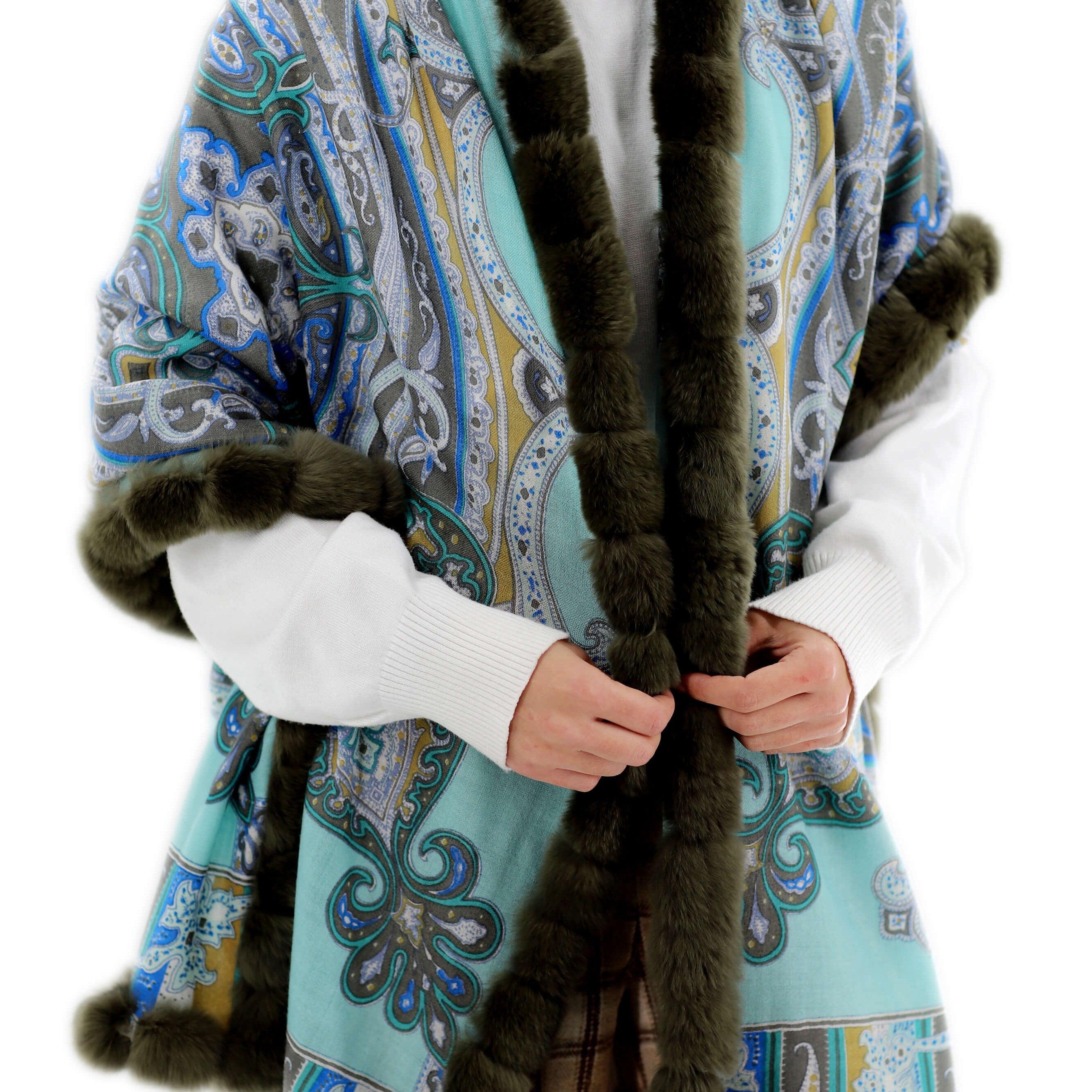 Oversized Paisley Print Wrap with Rex Rabbit Fur Trim - Green