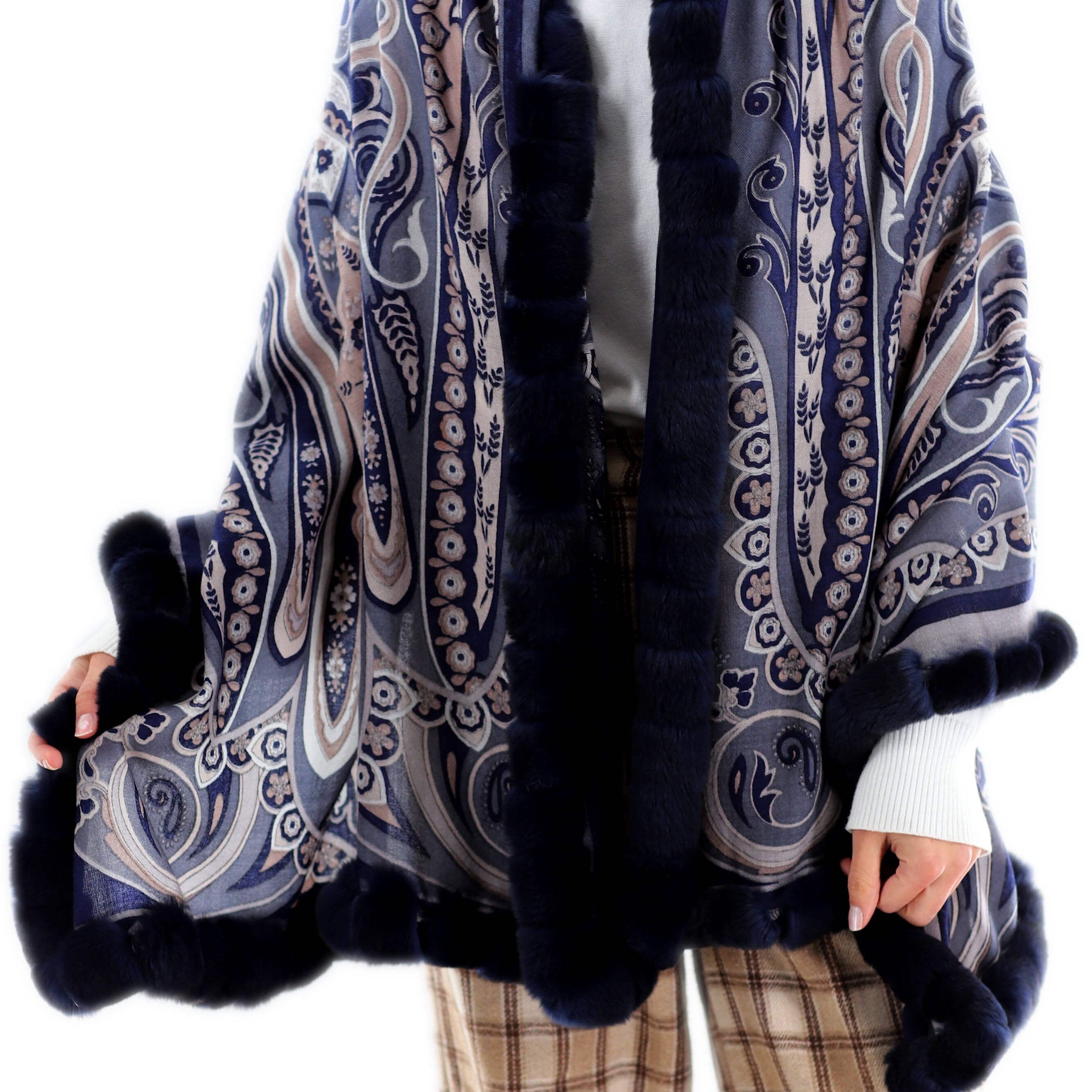Paisley Print 100% Wool Wrap with Rex Fur Trim - Navy