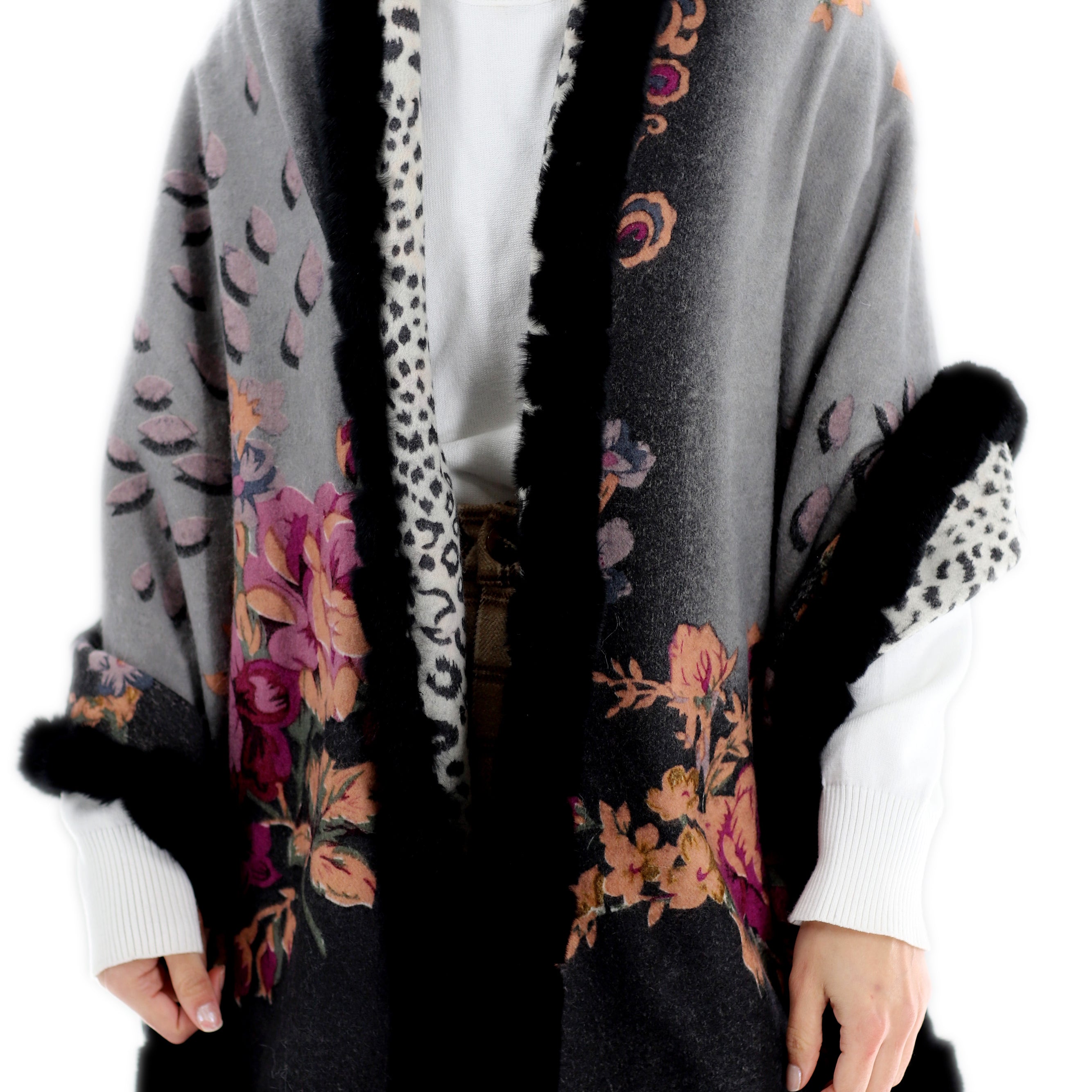 Floral Reversible Animal Print Wrap with Genuine Rex Rabbit Trim - 100% Wool - Black