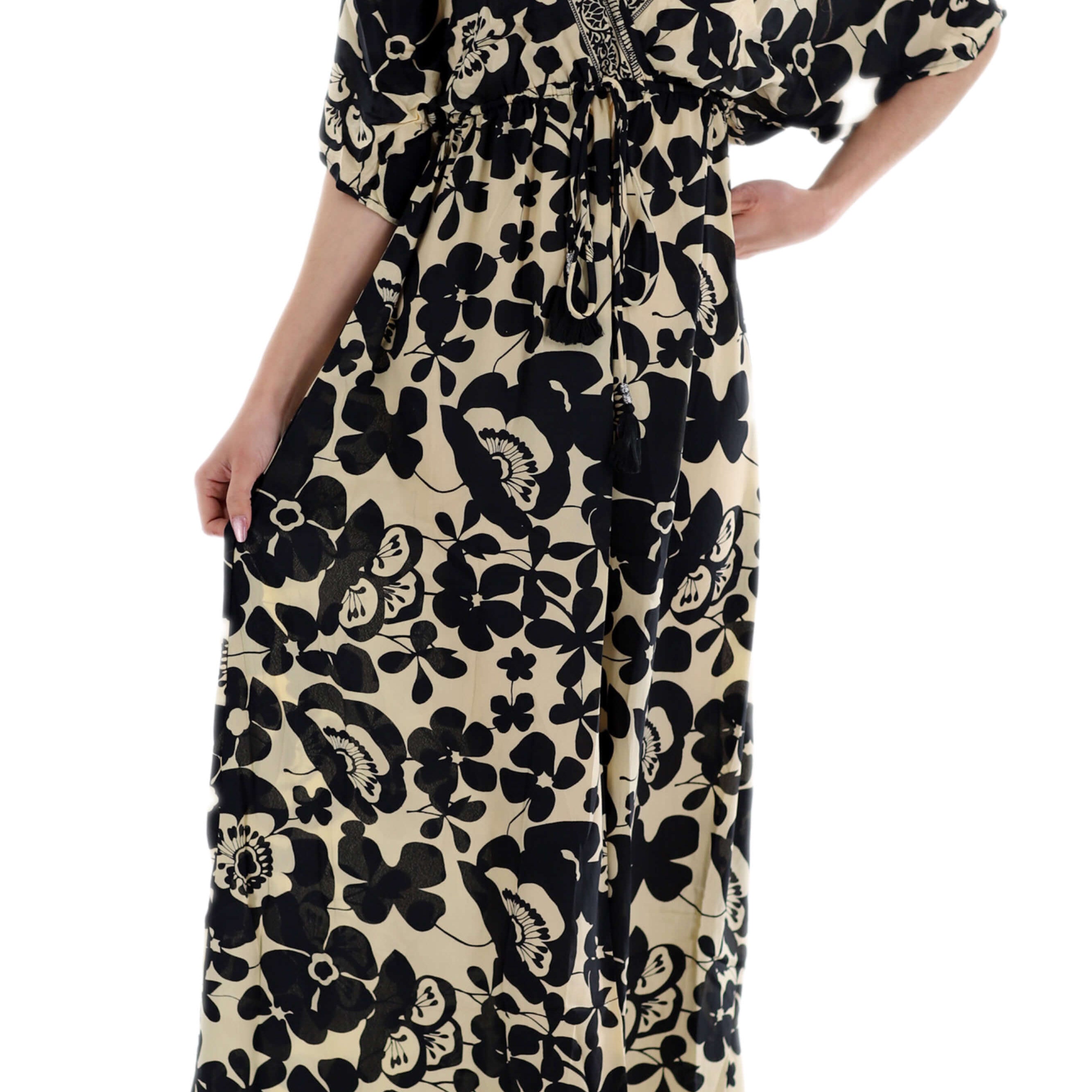 This enchanting maxi dress features a delicate floral pattern gracefully set against a classic black and ivory backdrop, creating a sophisticated and versatile look. The flowy silhouette adds an extra touch of grace, making it ideal for special occasions or elevated everyday wear. Crafted for comfort and style, the 'Amalia' Maxi Dress seamlessly blends fashion and femininity.