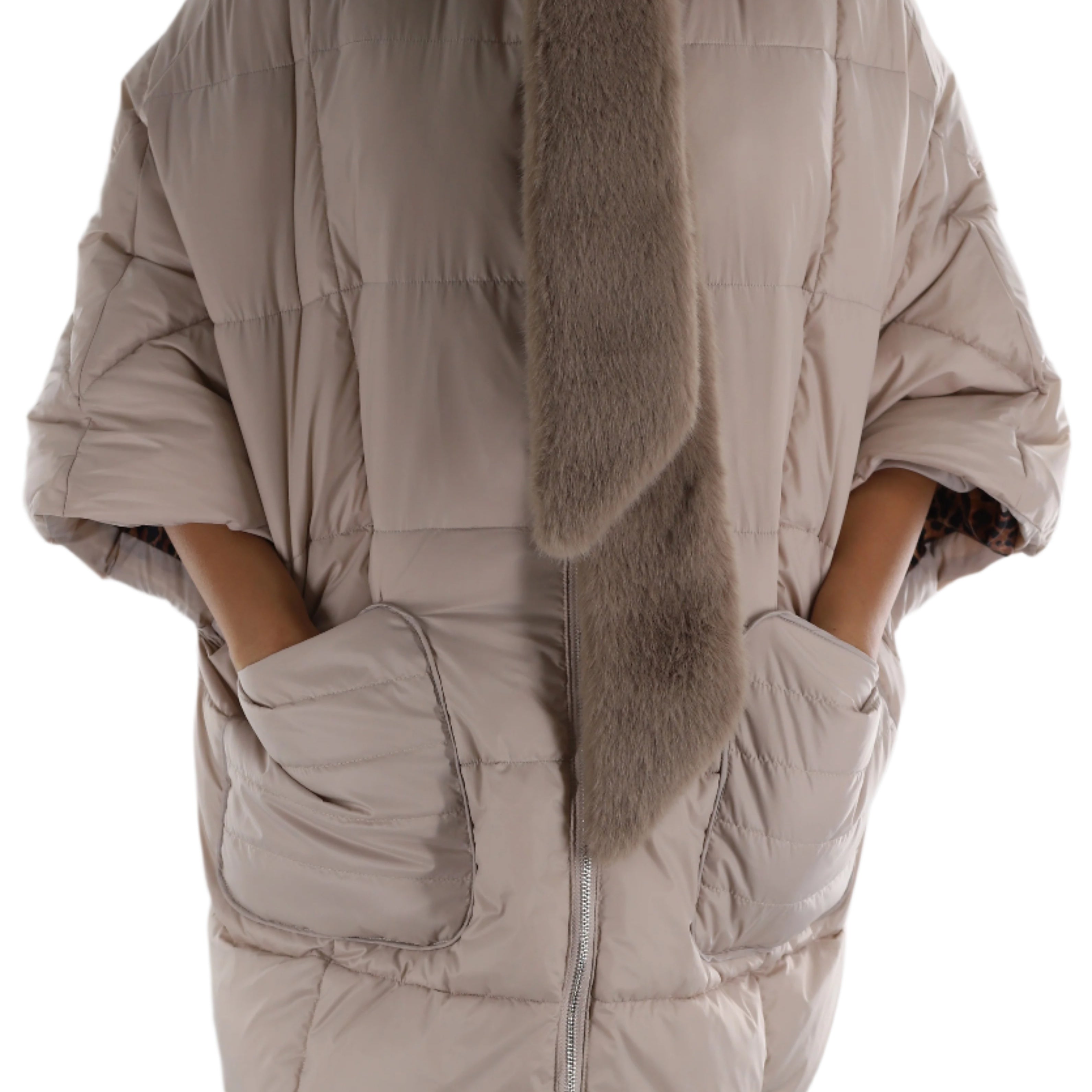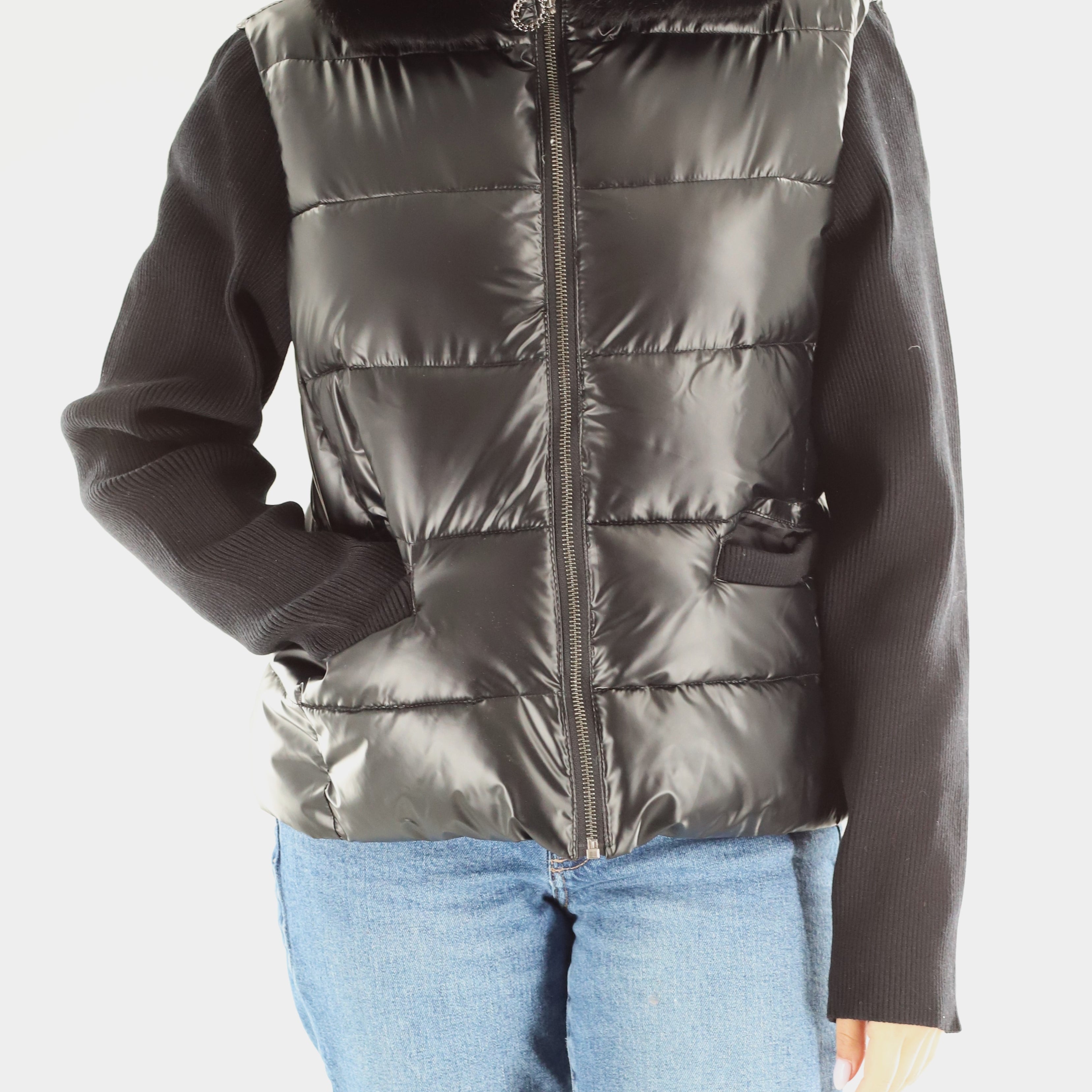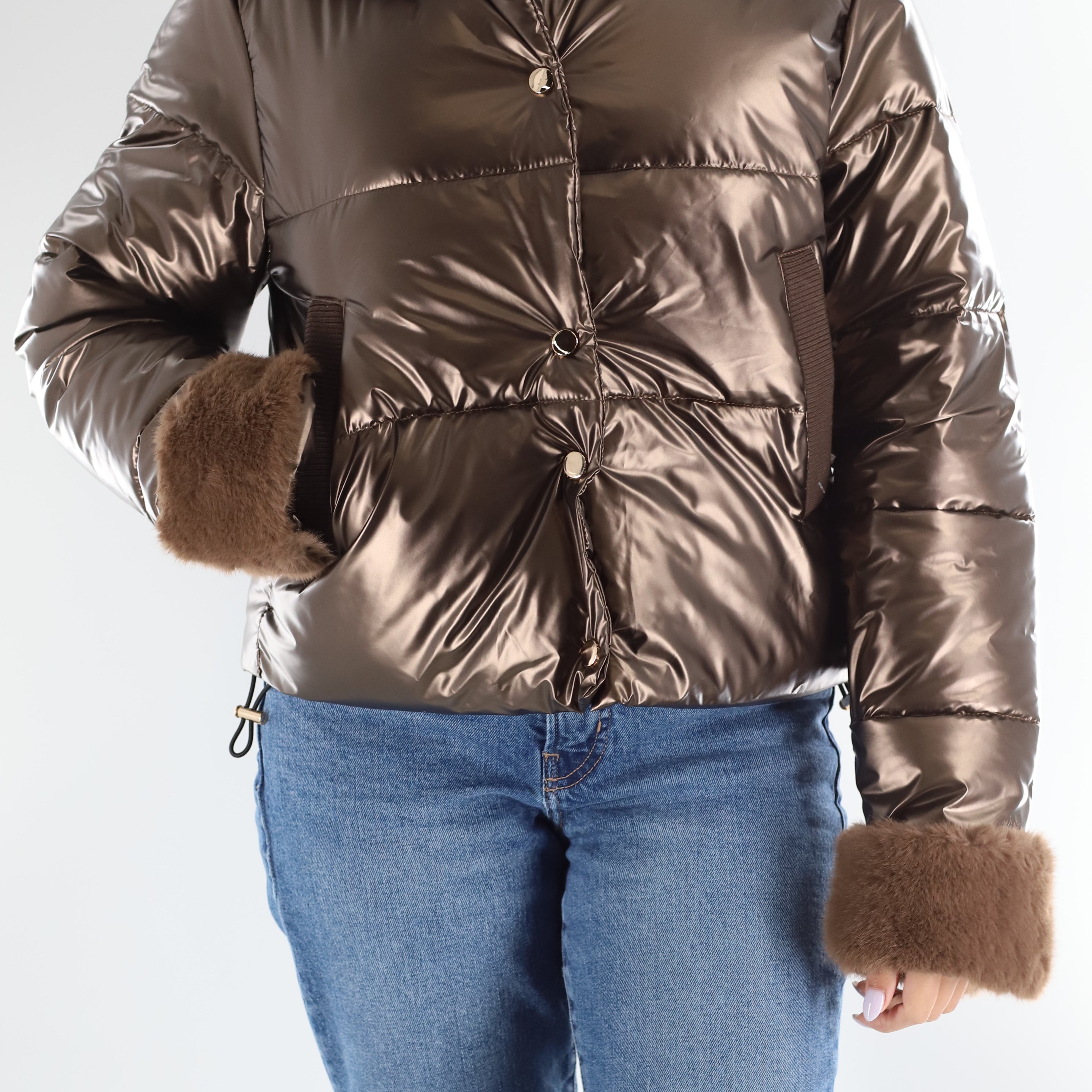 Metallic Puffer Jacket with Knit Sleeves & Faux Fur Detail