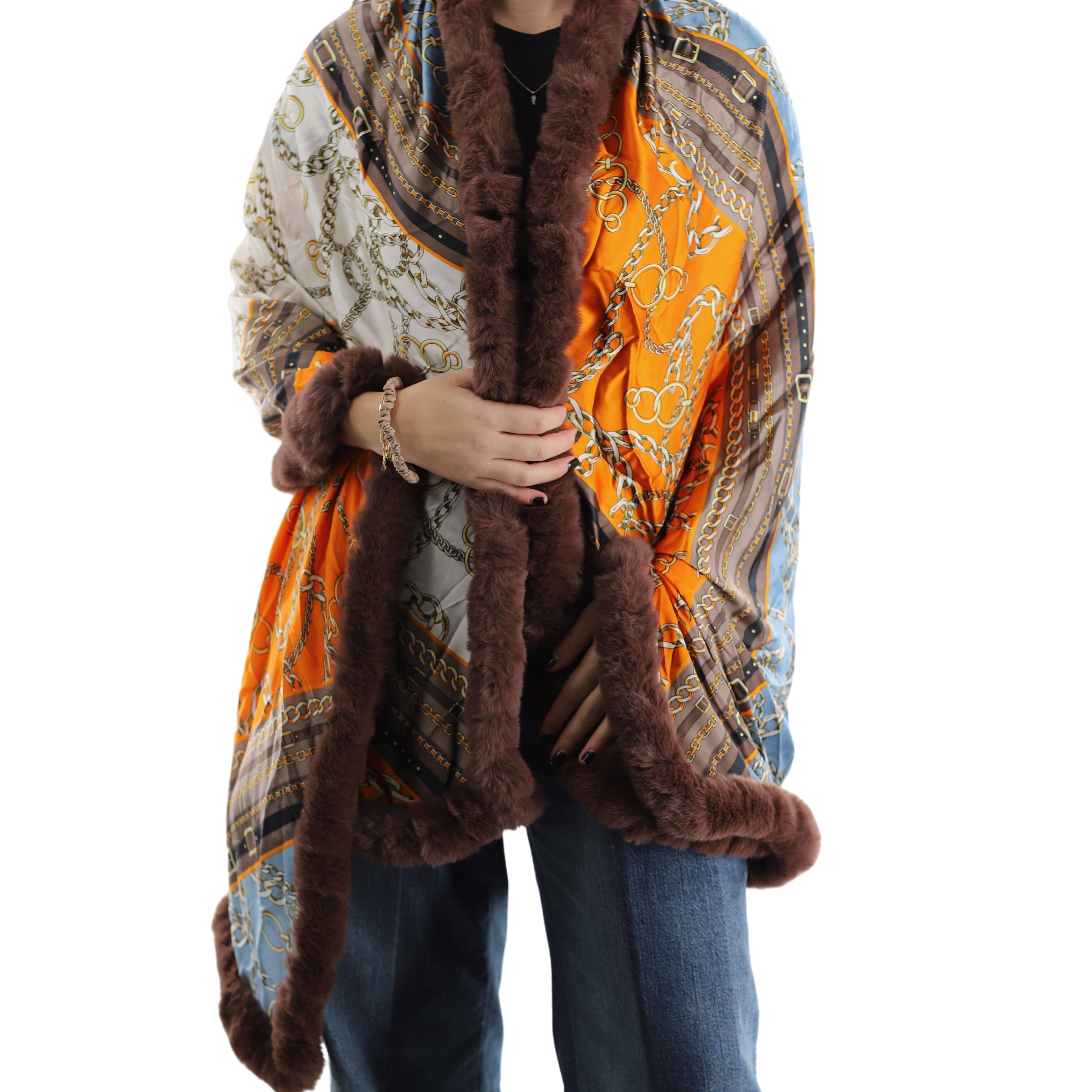 CHAIN PRINT WRAP WITH FAUX FUR TRIM