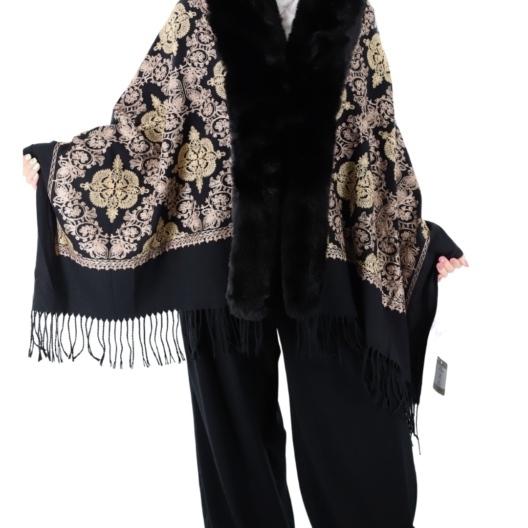 Embroidered Wrap w/ Faux Fur Trim