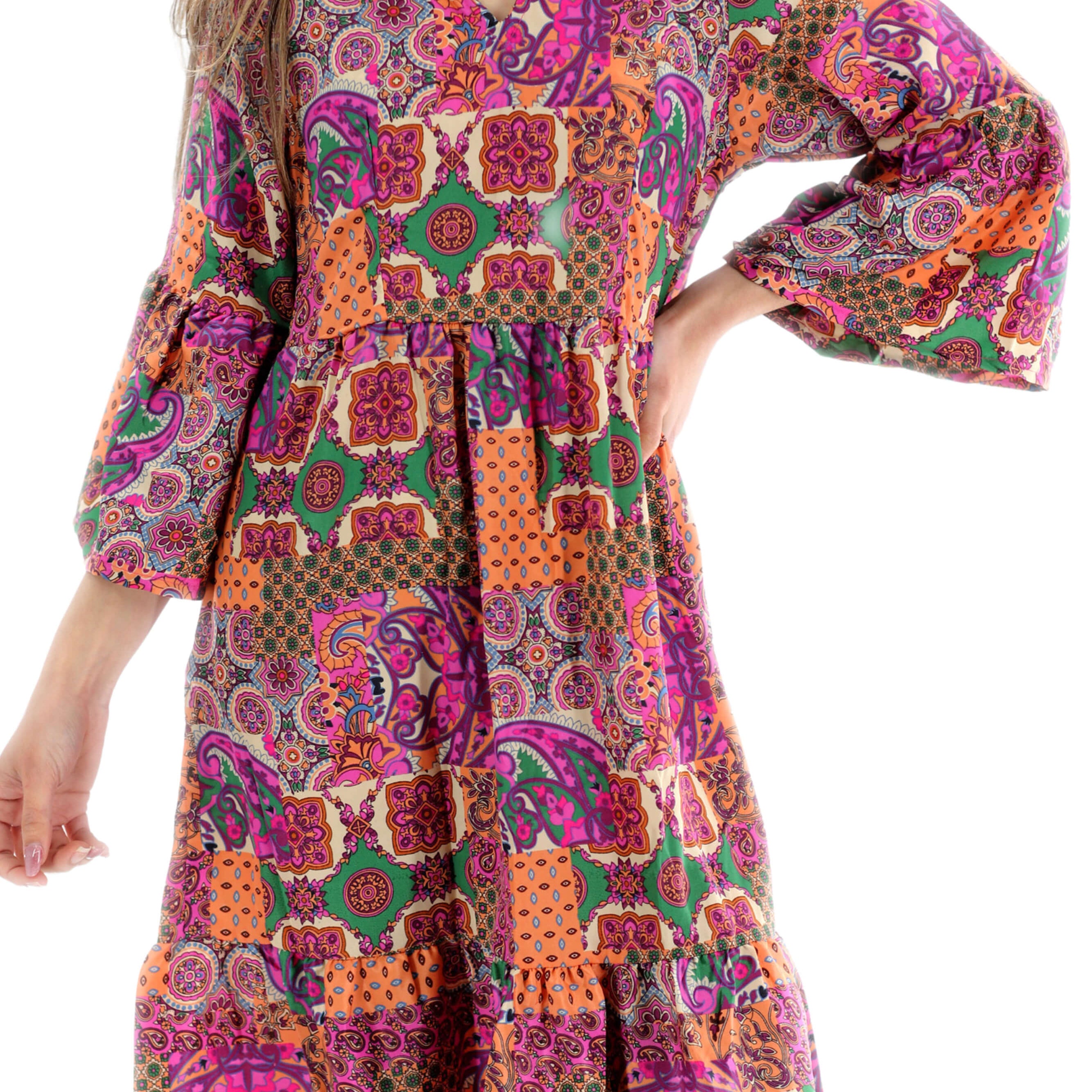 Flowy Paisley "Capri" Above Knee Dress in Pink Multi – a delightful fusion of boho flair and vibrant style. This dress features a whimsical paisley pattern in shades of pink, creating a playful and eye-catching look. The flowy silhouette and above-the-knee length add a touch of elegance, making it perfect for various occasions. Crafted for comfort and style, this dress is a standout piece for the fashion-forward.